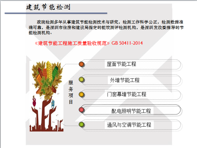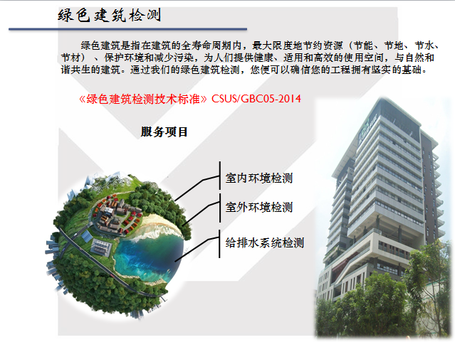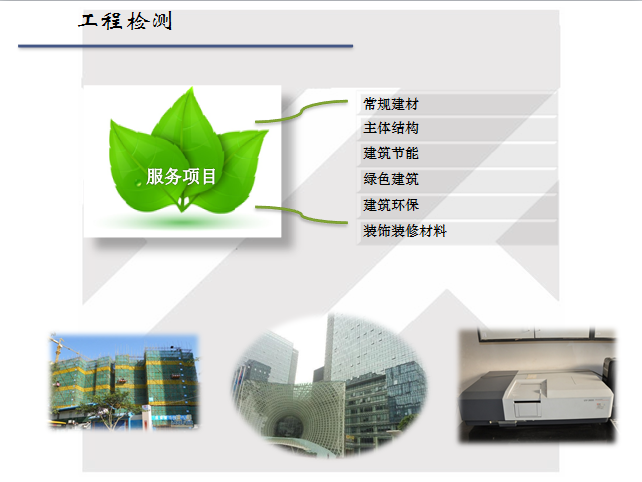 建筑工程檢測主要包含常規(guī)建材、主體結(jié)構(gòu)、建筑節(jié)能、綠色建筑、建筑環(huán)保、裝飾裝修材料檢測等幾大項,其中以建筑節(jié)能檢測、綠色建筑檢測和節(jié)能環(huán)保咨詢驗收服務(wù)為主。